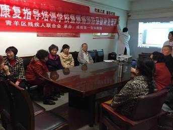 2015年3月20日,在草市街办玉带桥社区由成都市青羊区残联主办、成都第一骨科医院承办的“青羊区残疾人康复指导培训学校”第二期课程顺利开课,来自各街道和残联工作人员共计20余位学员参加了本次培训课程,本次授课在理论与实际相结合的模式下进行。