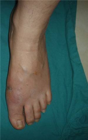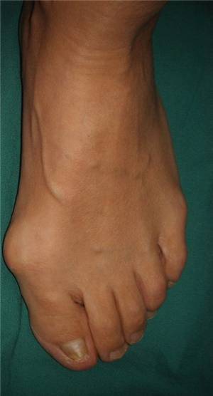 其发病除了遗传因素外,多与穿尖头鞋与高跟鞋有很大的关系。临床表现为踇囊炎疼痛和前足畸形,影响患者的生活、工作和学习,使病人的生活质量明显下降。